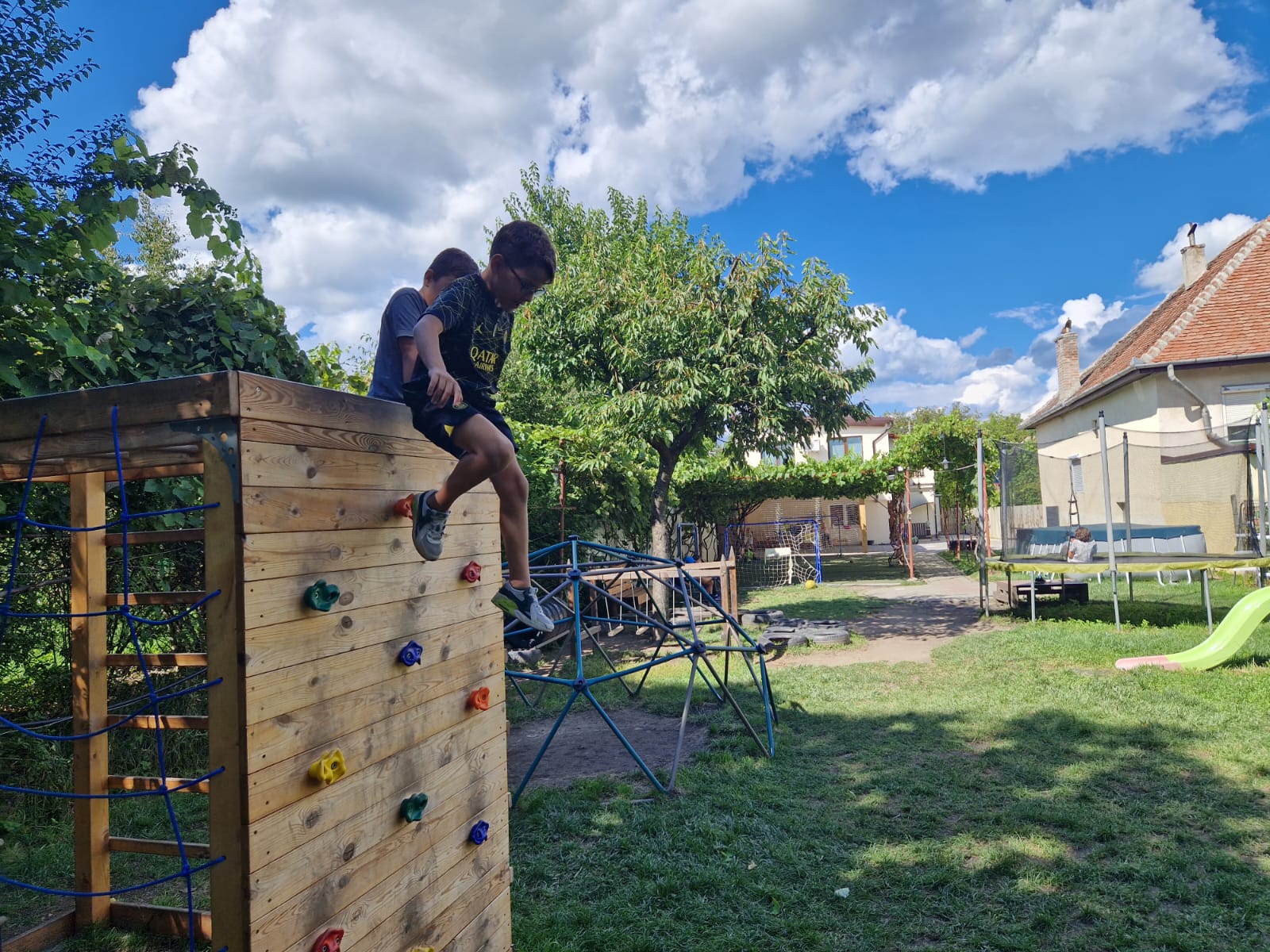 • Curte cu gazon, perete de cățărare și leagăn din lemn