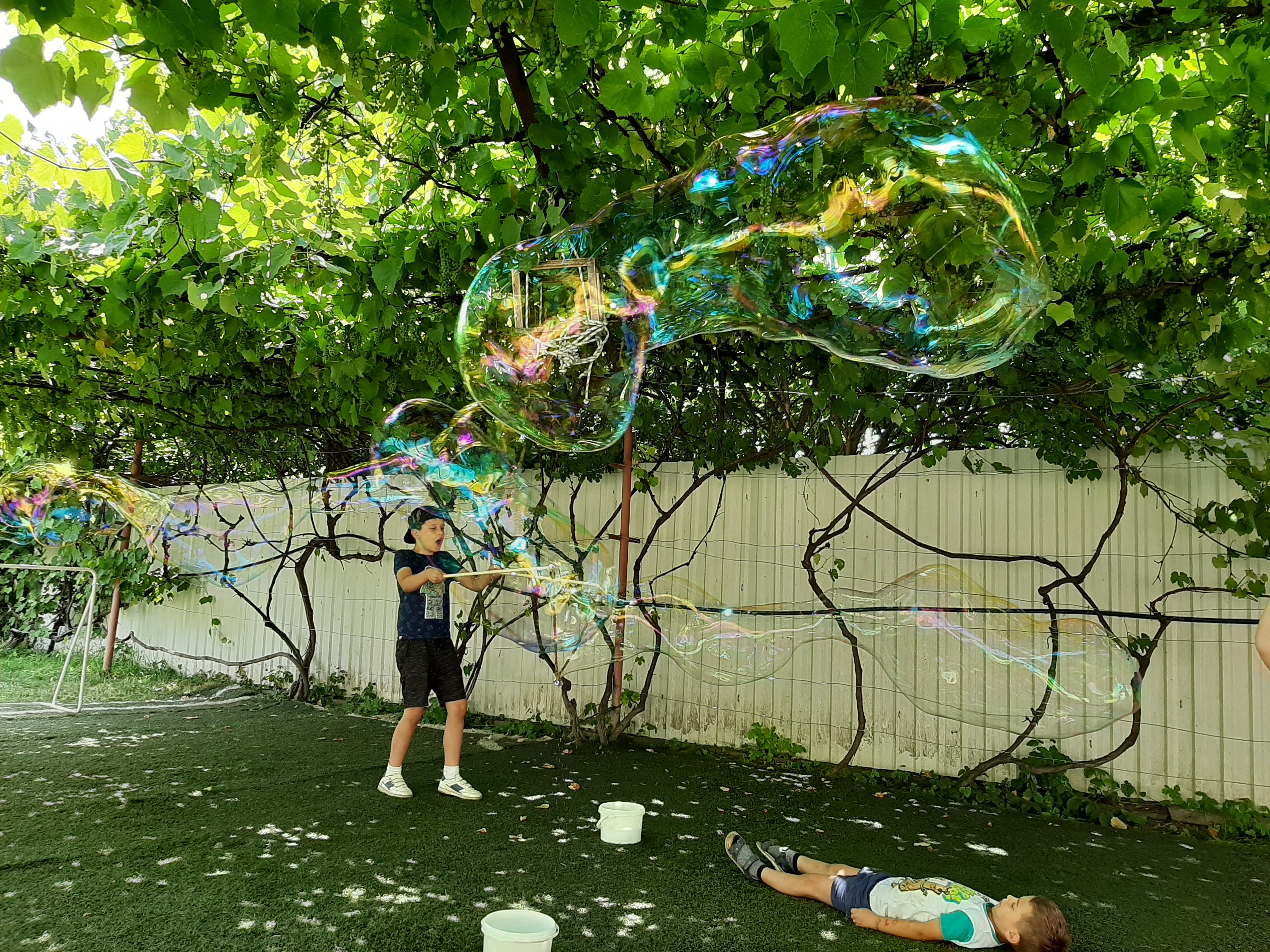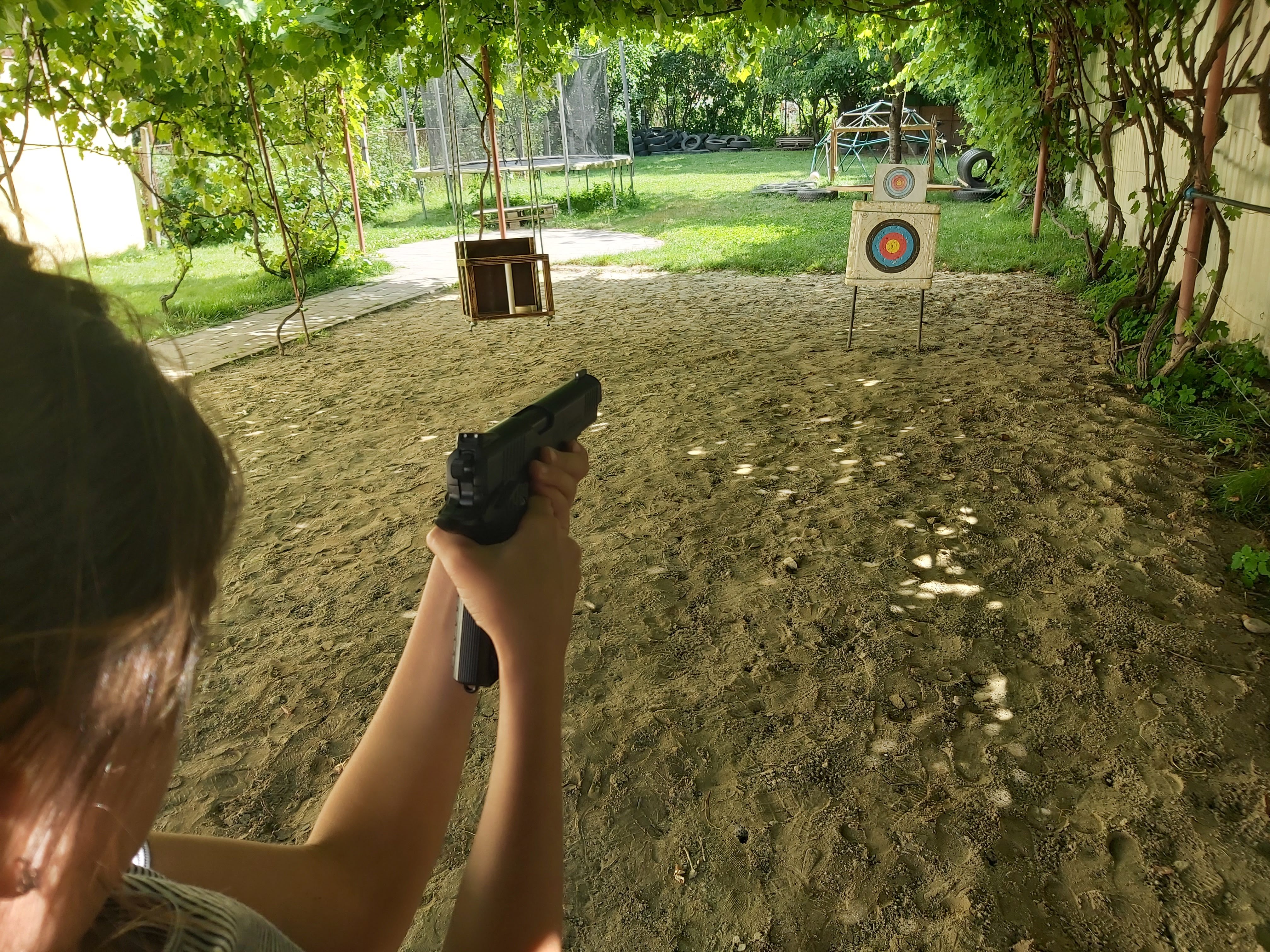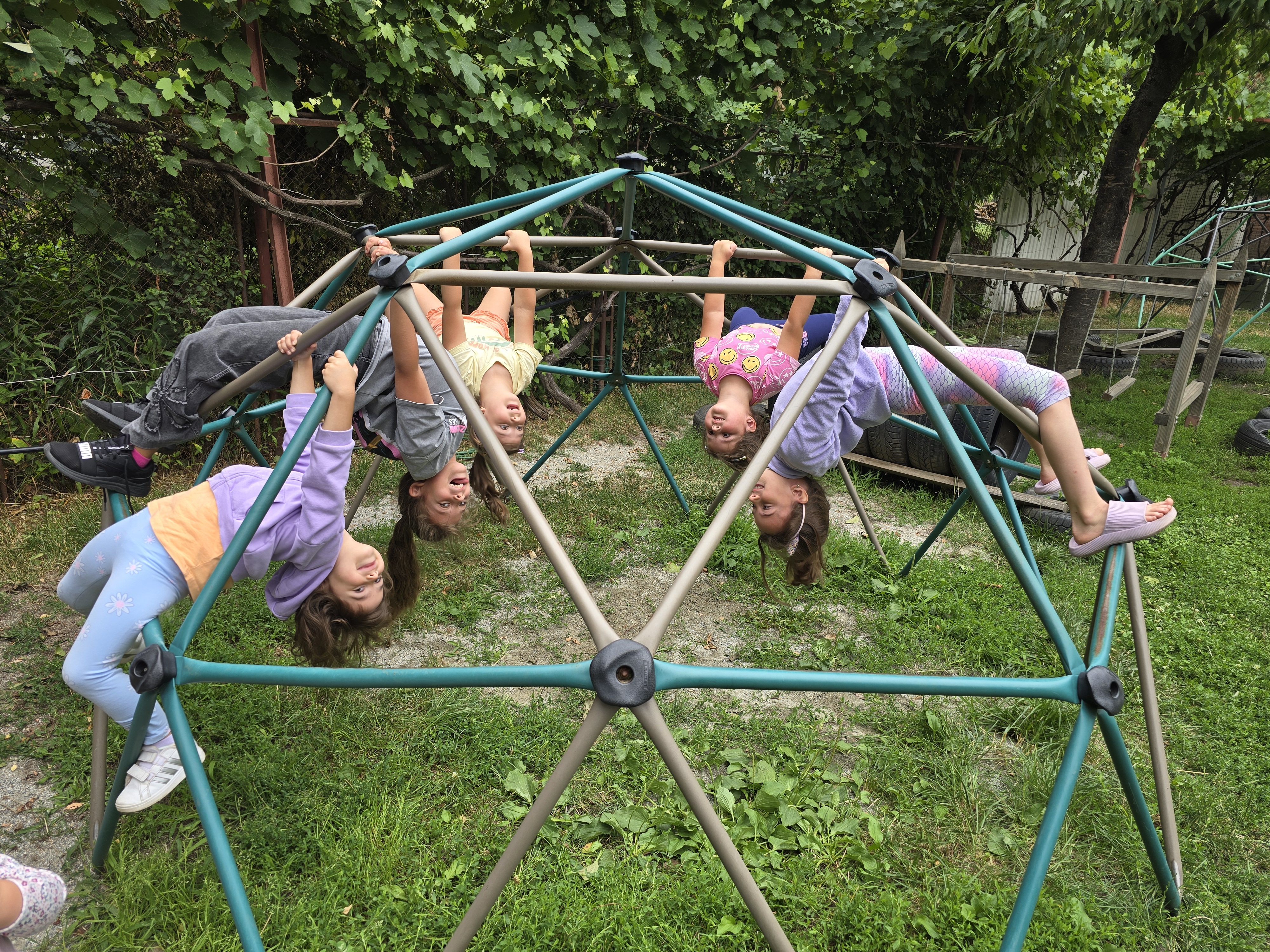 • Vedere printr-un cauciuc către o curte cu leagăne și copac.
