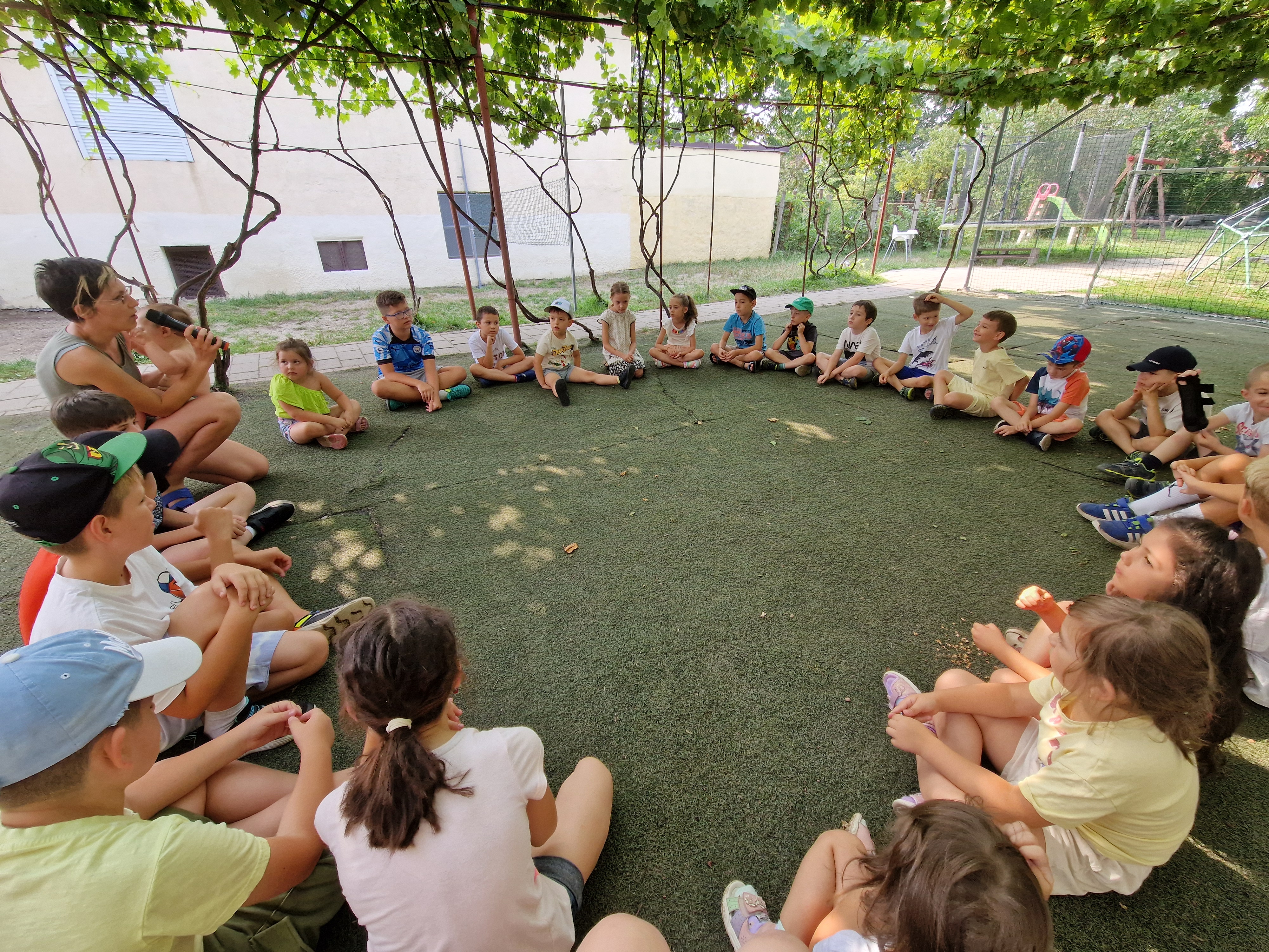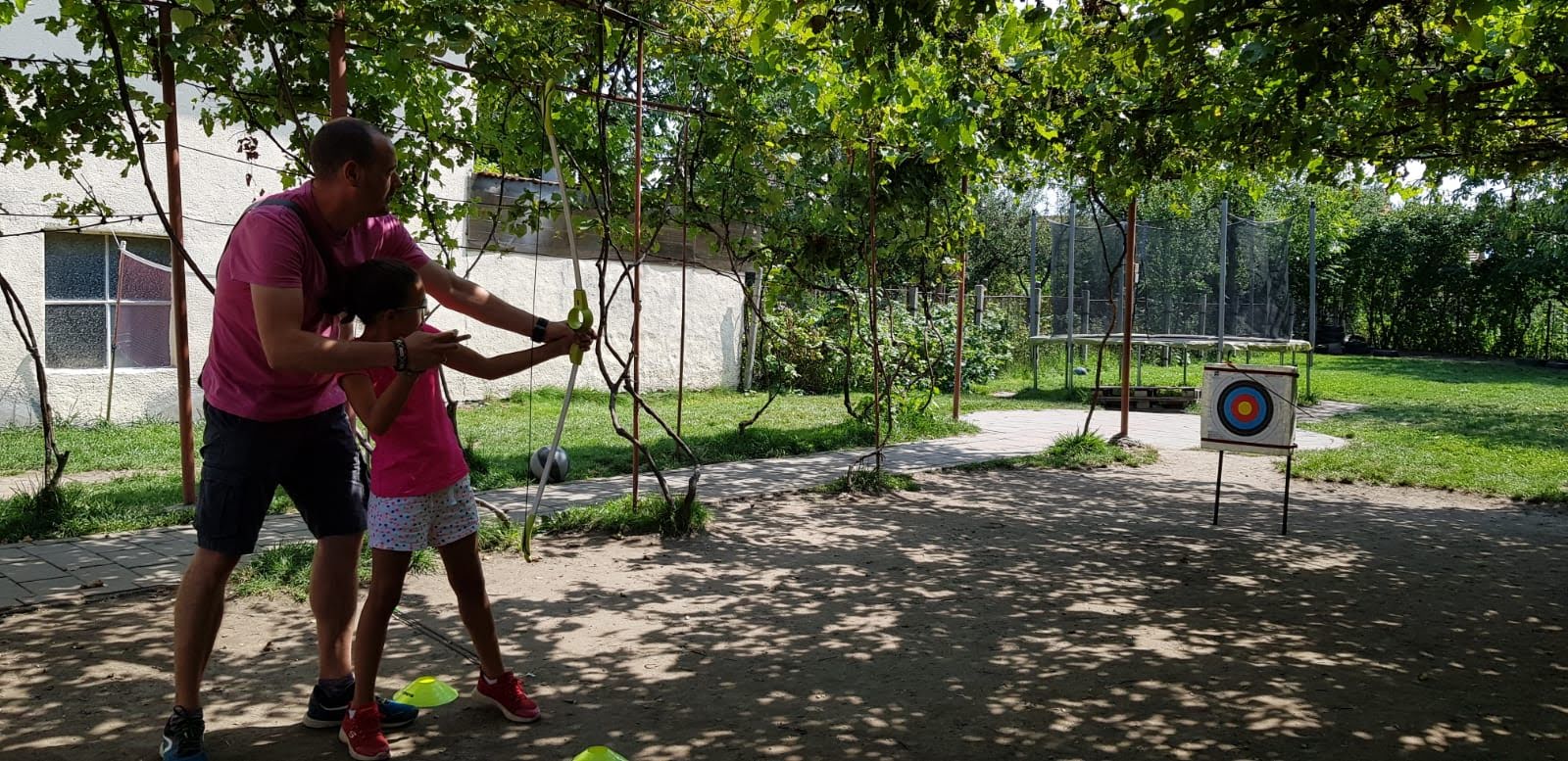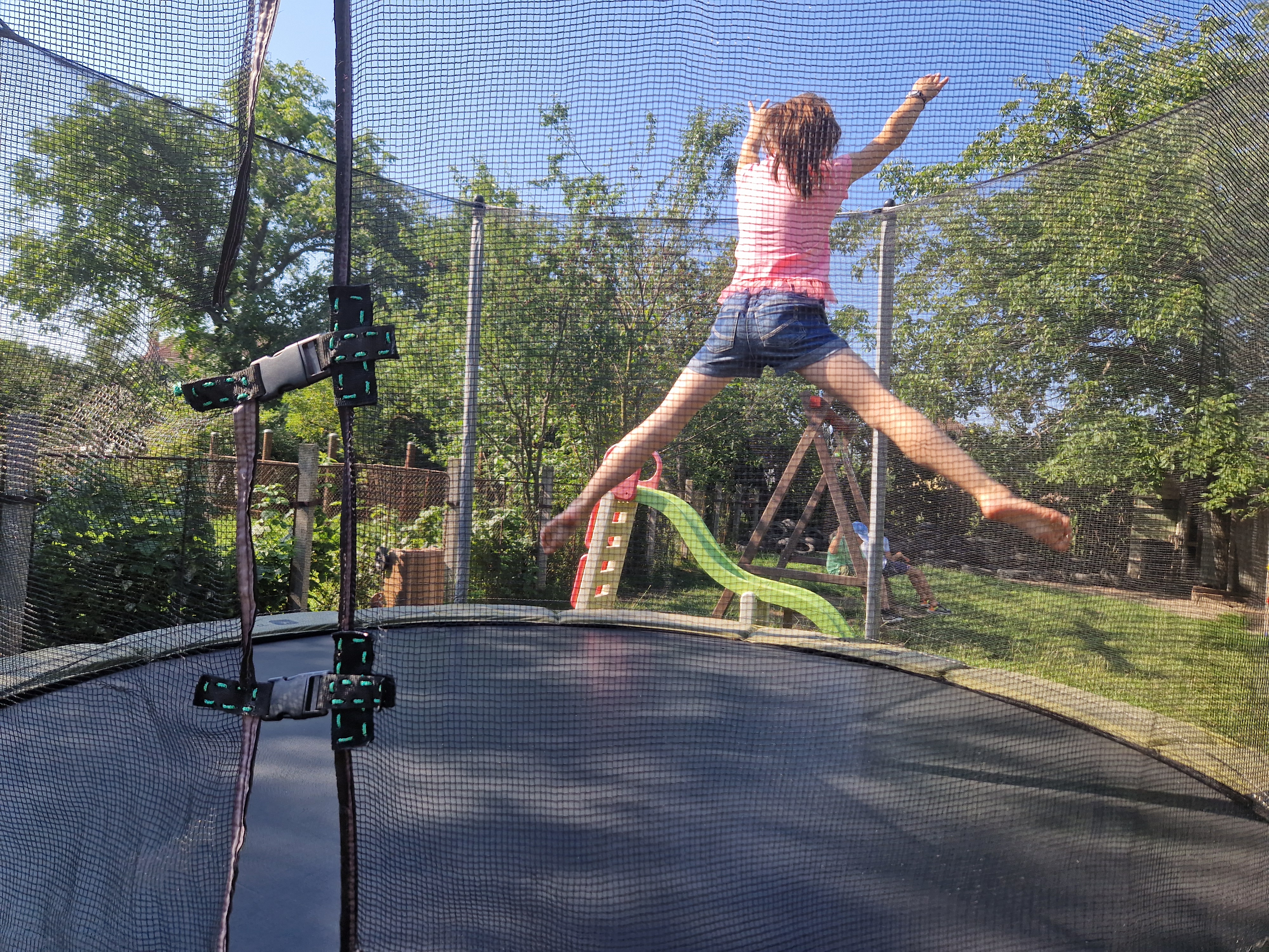• Loc de joacă în aer liber cu leagăne și trambulină